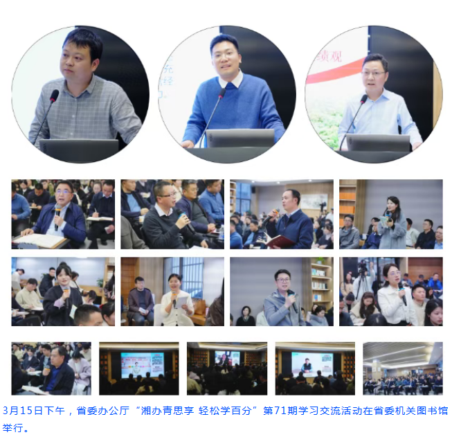 在“湘办青思享 轻松学百分”第71期学习交流活动现场,3名青年围绕基层治理、民营经济、乡村振兴等民生息息相关的主题,结合工作实际和自身经历展开交流讨论。