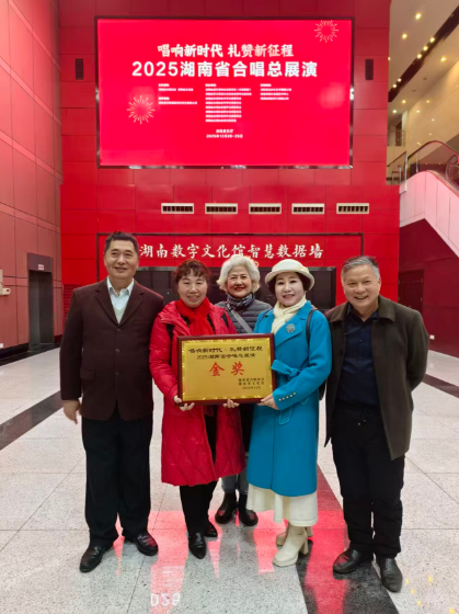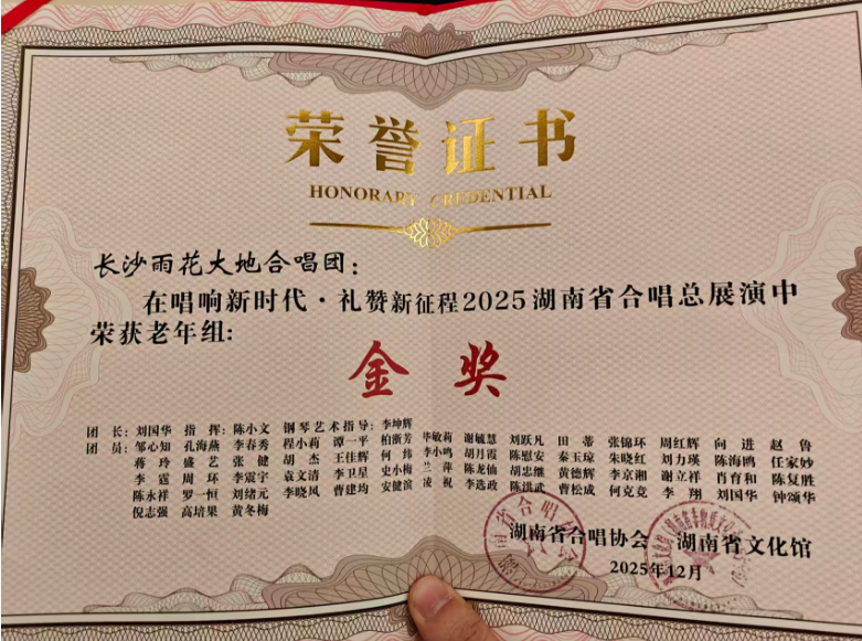 夜幕降临,华灯初上。"唱响新时代·礼赞新征程"2025湖南省合唱总展演颁奖音乐会的舞台上,当主持人宣布长沙雨花大地合唱团荣获金奖的那一刻,所有的付出与坚持都得到了最美的回报。陈小文老师手中的优秀指挥奖,李坤辉老师获得的优秀钢琴伴奏奖,更是对这支团队专业水准的最好肯定。