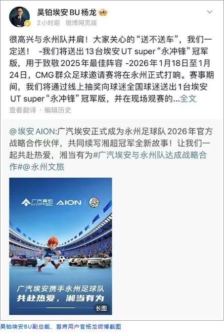 1月9日,广汽埃安联合文旅部门奖励球队“永冲锋”冠军版汽车的举措,进一步将赛事荣誉与城市品牌深度绑定。