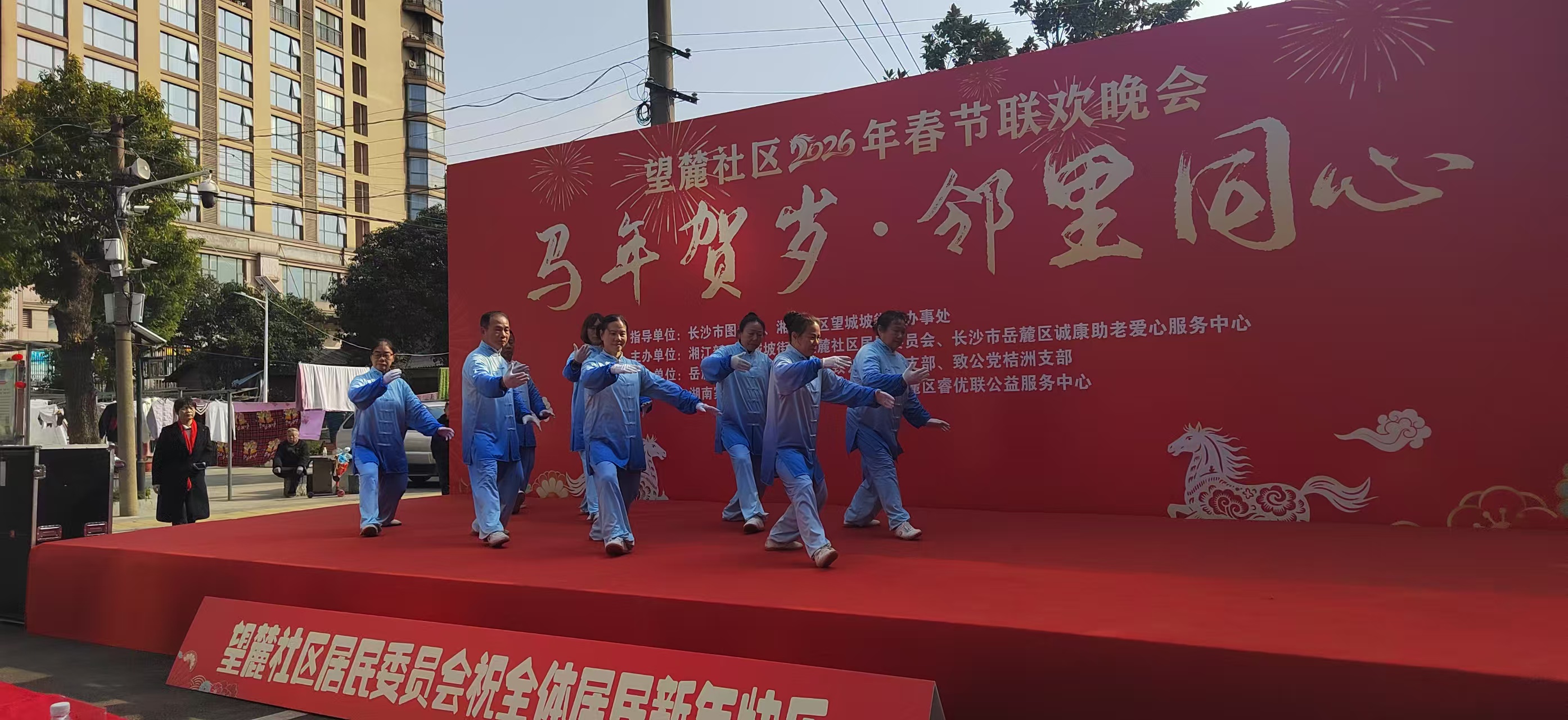 武术表演将气氛推向高潮。长拳虎虎生风,刀法寒光凛冽,少年英气与中华武魂交相辉映。黄梅戏《谁料皇榜中状元》婉转悠扬,让传统戏曲的魅力在现代社区里重新焕发生机。而舞蹈《好运全都来》则以欢快的节奏、饱满的热情,将"好运"二字化作可视可感的肢体语言,感染着在场的每一个人。三轮幸运抽奖穿插其间,每一次号码的揭晓都伴随着欢呼与掌声。奖品或许不重,但那份被幸运眷顾的惊喜,却是千金难买。致公党的合唱《百年同心》更是以铿锵之音,唱出了民主党派与中国共产党风雨同舟、肝胆相照的真挚情怀。